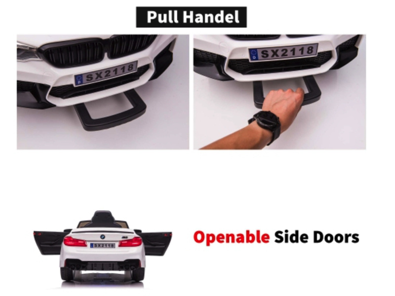 Deze uiterst sportieve BMW M5 kinderauto is geproduceerd onder licentie van BMW en uitgevoerd met heel veel opties. De BMW Accu Voertuig is voorzien van 2 krachtige motoren en heeft 3 verstelbare snelheden waarmee de auto tussen de 3 en 6 km per uur kan rijden. Verder is kinderauto voorzien van volledig 2 echte deuren, rubberen bandengeveerde wielenleder zitje met een 5-punt sport gordel en een 2.4 GHz afstandsbediening met ‘soft start’ functie.  De BMW M5 heeft naast de koplampen, achter verlichting en verlichte dashboard ook verlichte beenruimte en verlichte onderstel. De toeter en muziek knopjes zijn op het stuur en eigen muziek afspelen kan op de muziek module met USB- en MP3-ingangen.
