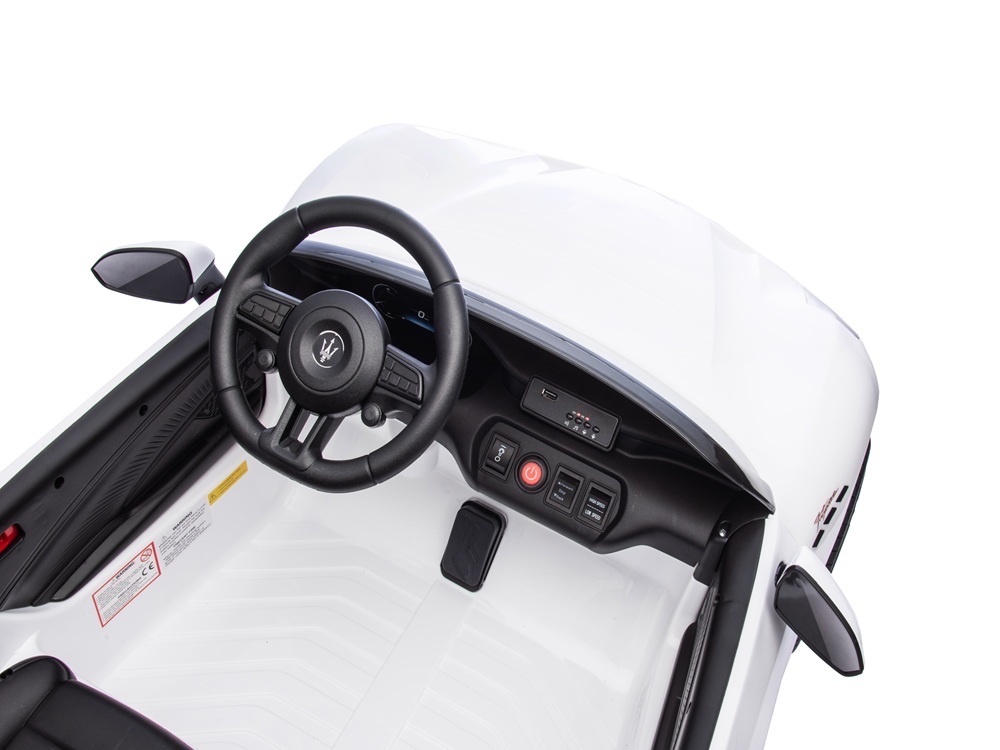 Maserati GranTurismo Folgore 2-zitter, 12V kinderauto heeft rubberen banden, werkende verlichting, geluidseffecten, een soft start en afstandsbediening. Luxe, veilig én stoer rijplezier voor jonge coureurs!